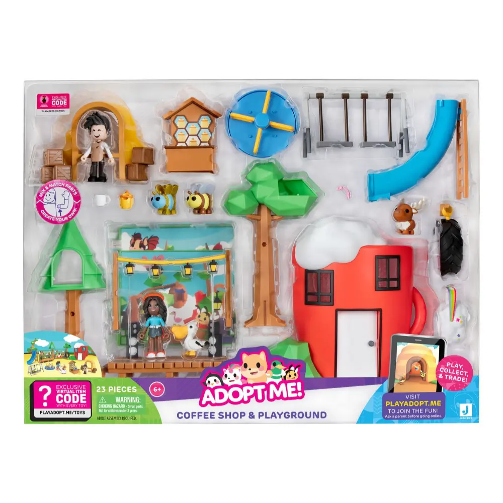 نقدم لكم مجموعة لعب Adopt Me مقهى وحديقة! هذه الإضافة الجديدة والمثيرة لعالم Adopt Me ستسعد بالتأكيد اللاعبين من جميع الأعمار. بفضل تصميمها الجذاب والمميز بألوانه الزاهية، تُعد مجموعة لعب Adopt Me مقهى وحديقة المكان المثالي للاسترخاء والتواصل مع حيواناتك الأليفة المفضلة. سواء كنت تتناول قهوة ساخنة أو تلعب على الأراجيح، فإن مجموعة اللعب هذه ستوفر بالتأكيد ساعات من المرح لك ولأصدقائك ذوي الفراء!