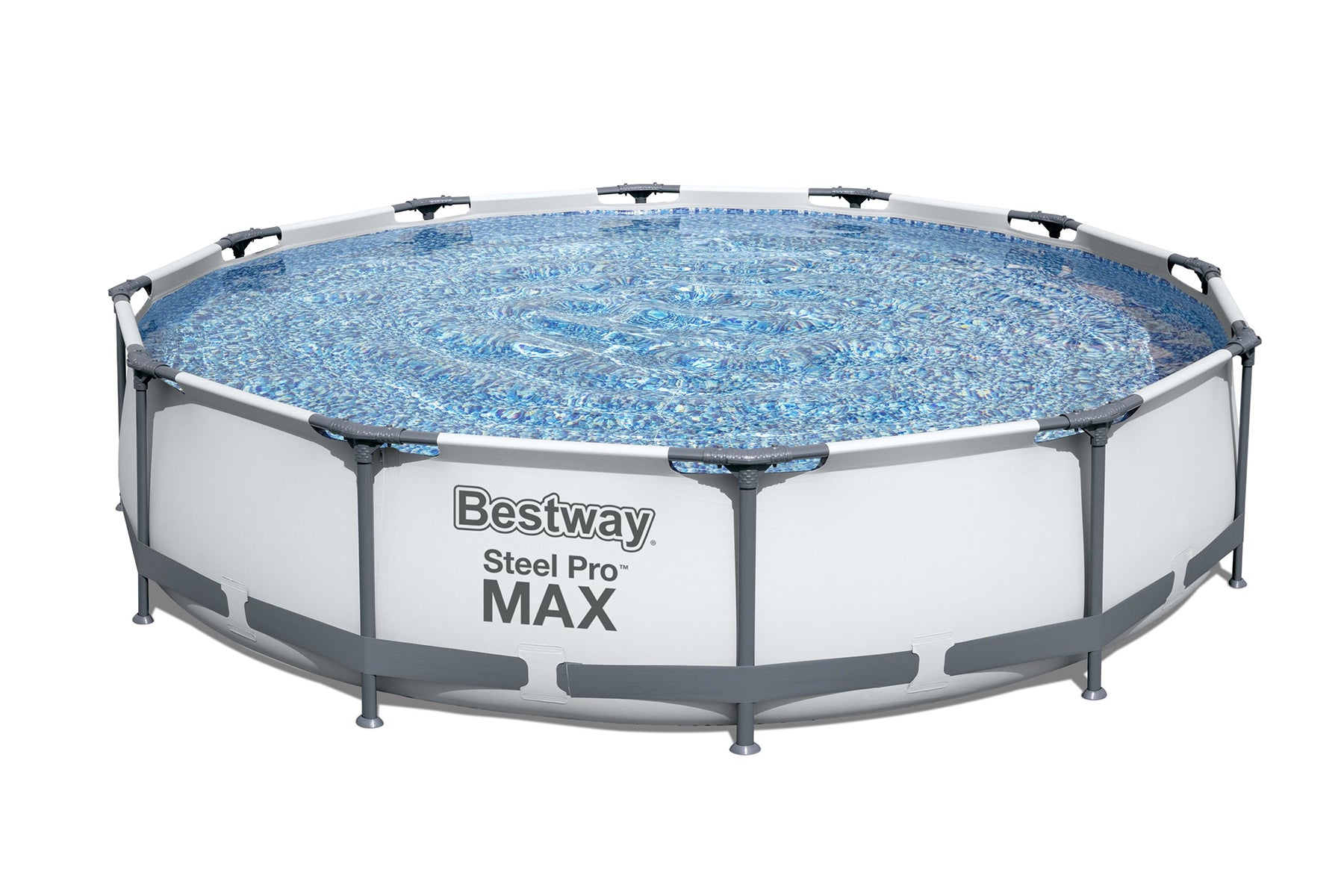 The Bestway Steel Pro MAX™ 12 ft × 30 in (3.66 m × 76 cm) Pool Set is designed for durability, stability, and easy backyard enjoyment. Built with corrosion-resistant metal frames and heavy-duty 3-ply PVC and polyester sidewalls, this pool offers long-lasting performance. The printed mosaic inner liner adds a stylish finish, while the round shape allows for easy installation, enhanced stability, and efficient use of space without the need for lateral supports. When the season ends, draining and storage are simple thanks to the built-in flow control valve that connects to a garden hose.