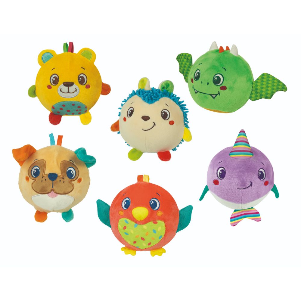 Six cute little cuddle buddies - lovely creatures for playtime filled with snuggly sweetness! Each single animal is child friendly! The spherical shape, size and super-soft texture help babies to develop their manual dexterity. The animals are enhanced with rustling parts, a series of different fabrics and an integrated rattle to amuse babies while stimulating their sense of hearing and touch. A loop allows it to be hung up and taken with you on the move. The dog, bear, hedgehog, little bird, narwhal and baby dragon will soon become baby’s best buddies!