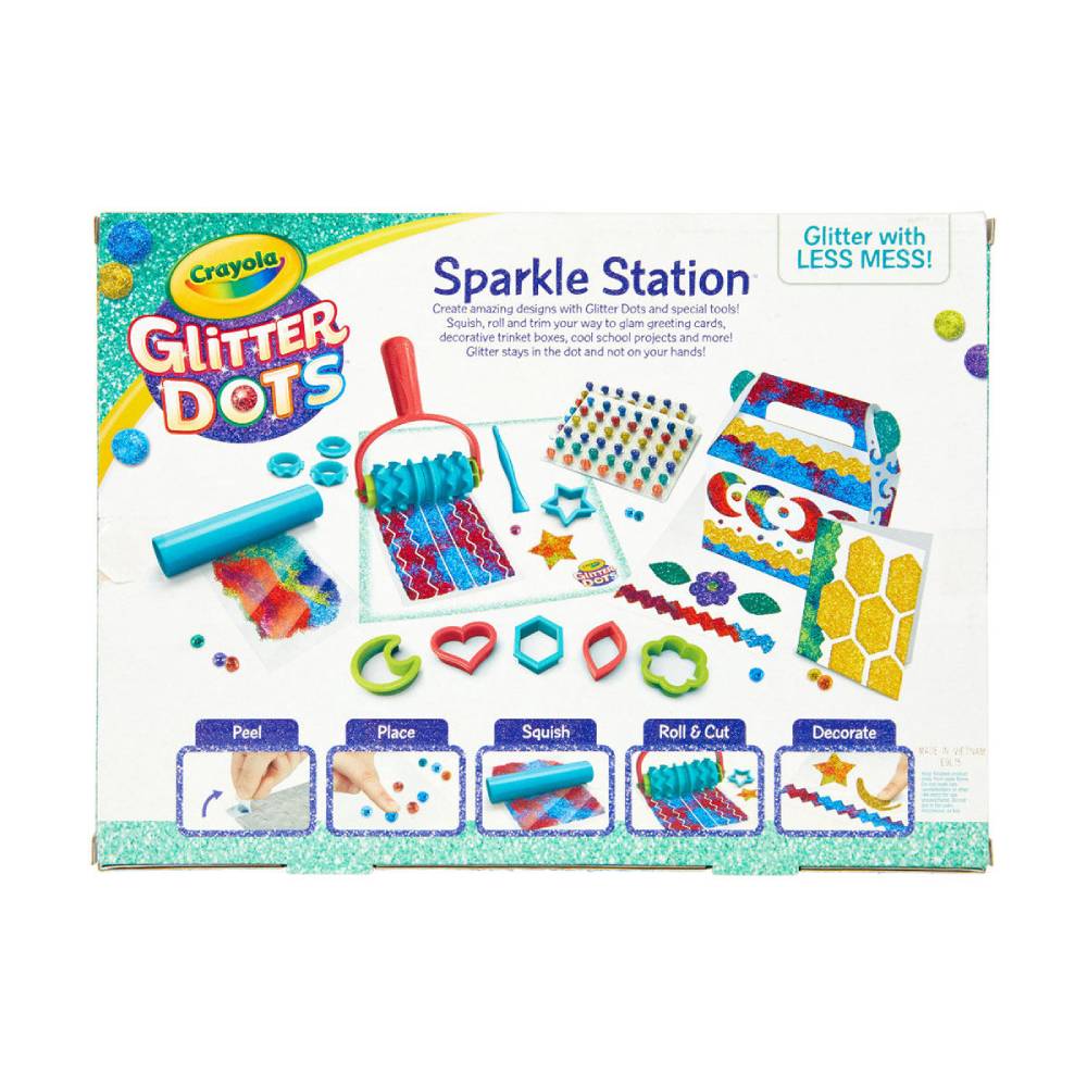 Glitter Dots are an innovative glitter-infused dot that sticks to a variety of surfaces to make sparkly designs. Glitter Dots Sparkle Station allows you to roll, cut, and decorate with Glitter Dots in a fun new way. Kids can experiment with adding their Glitter Dots to paper, wood, felt, papier-mâché, fabrics, foam board, and more. This set includes a collection of art tools for kids, providing a number of fun ways to apply Glitter Dots. Set includes 84 Glitter Dots, 1 Roller, 9 Roller Cutter At