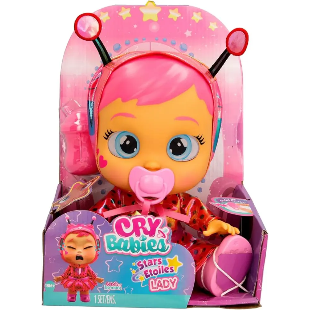 انغمس في عالم Cry Babies السحري، والتقِ بالسيدة الساحرة من كوكب الدموع! تتميز Lady بشعر لامع وملون، وتلبس ملابس فضائية رائعة ولامعة يمكن ارتداؤها وخلعها! مثل جميع Cry Babies، تبكي Lady دموعًا كبيرة عندما تُزال منها الحلمة. لكن هذا ليس كل شيء: إن إضاءة عينيها عندما تبكي أمر سحري ببساطة! لتهدئة Lady، ما عليك سوى إعادة الحلمة إلى فمها أو إطعامها بزجاجة رضاعة الأطفال المفضلة لديها. عندها تتوقف Lady عن البكاء في لمح البصر وتكون مستعدة للخدعة التالية. تتضمن 4 إكسسوارات: ملابس لامعة، وحذاءين، وحلمة، وزجاجة رضاعة.
