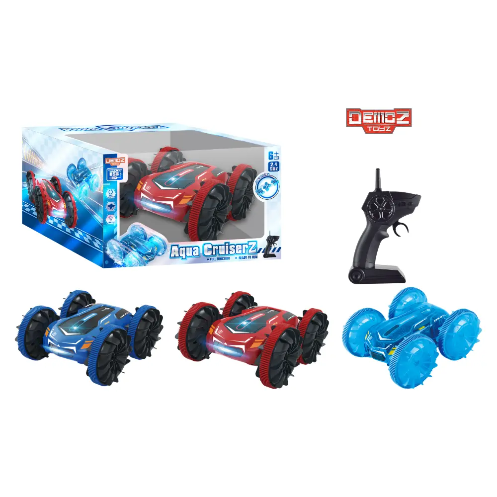 انطلق في مغامراتك مع مركبة التحكم عن بعد Aqua CruiserZ! هذه المركبة عالية الأداء مصممة للعب على اليابسة والماء على حد سواء. بفضل قدراتها البرمائية، يمكنها الانزلاق بسهولة على العشب والرمل والأسفلت وحتى الماء. يسمح التصميم ثنائي الجوانب بإجراء مناورات وخدع مثيرة بزاوية 360 درجة، بينما تضمن الإطارات ذات الإمساك العالي قوة جر ممتازة للمتعة على جميع أنواع التضاريس. مثالية للأطفال من عمر 6 سنوات فما فوق، توفر Aqua CruiserZ متعة لا حدود لها على أي سطح.