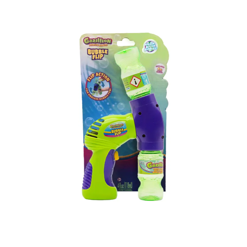 نقدم لكم جهاز فقاعات غازيليون بابلز Bubble Flip لمتعة لا تتوقف من الفقاعات! مع تصميم الحركة بالقلب، لا تنتهي متعة الفقاعات أبداً! قم بالتحميل عن طريق تدوير زجاجة المحلول سعة 4 أونصات في جهاز نفخ الفقاعات، وبمجرد أن يمتلئ، اضغط على الزناد لبدء نفخ تيار من الفقاعات. وبمجرد أن تنفد الزجاجة، قم بقلب الجزء الأمامي من الجهاز، واستخدم الزجاجة كحاملة، واضغط على الزناد مرة أخرى لمزيد من الفقاعات! يتضمن كل جهاز Bubble Flip زجاجة واحدة من محلول غازيليون بابلز سعة 4 أونصات. مناسب للأعمار من 3 سنوات فما فوق.