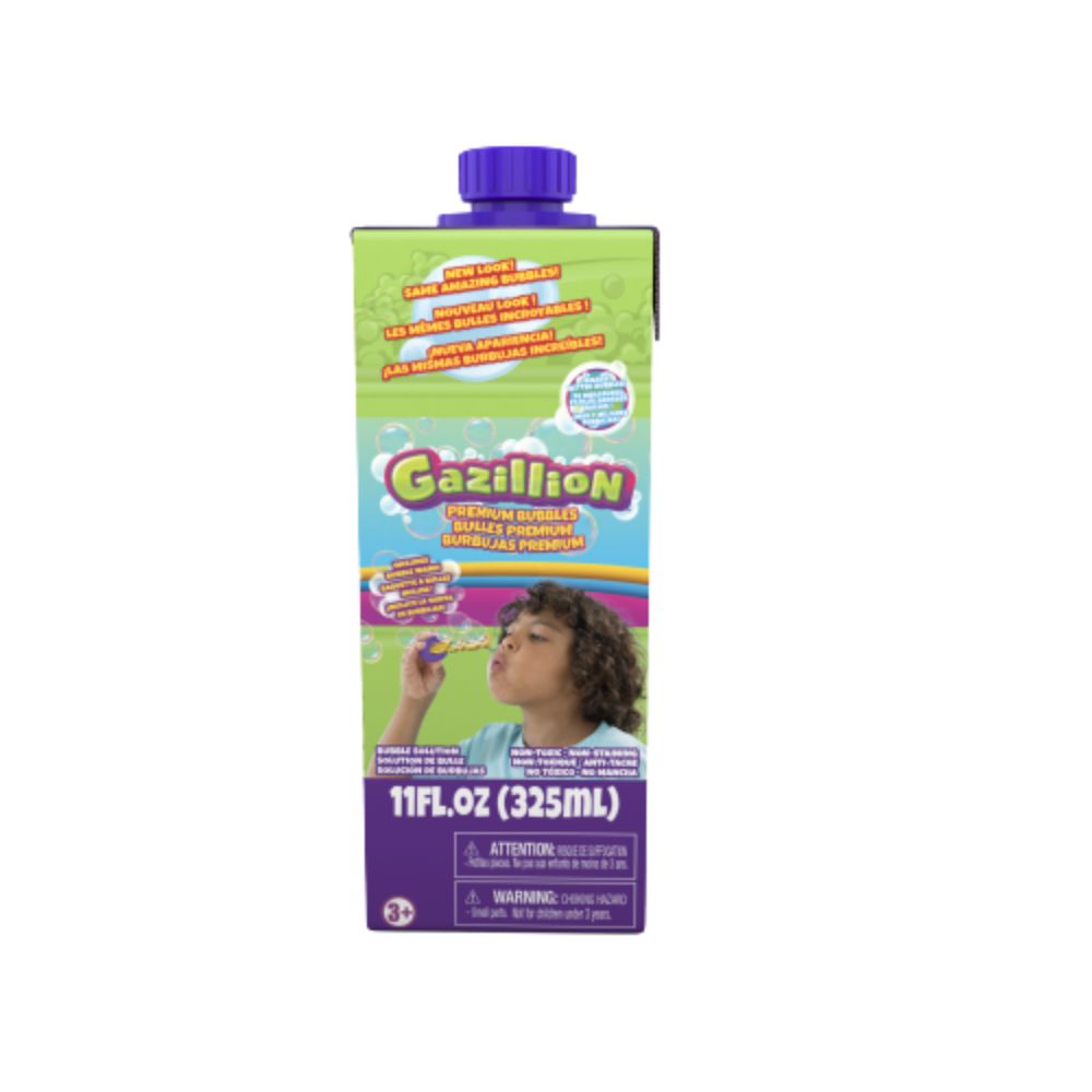 New look, same premium bubble solution! Our top secret “super solution,” formulated to create the biggest, brightest, and most colorful bubbles, now comes in box packaging thats more sustainable! Each 11-ounce box of Gazillion Bubbles solution comes with a specially designed bubble wand that can be attached to the side of the box and works with any Gazillion Bubbles product. Our premium solution is safe, non-toxic, and stain-free! With Gazillion Bubbles, you'll have tons and tons of bubble fun! Appropriate for ages 3 years and up.
