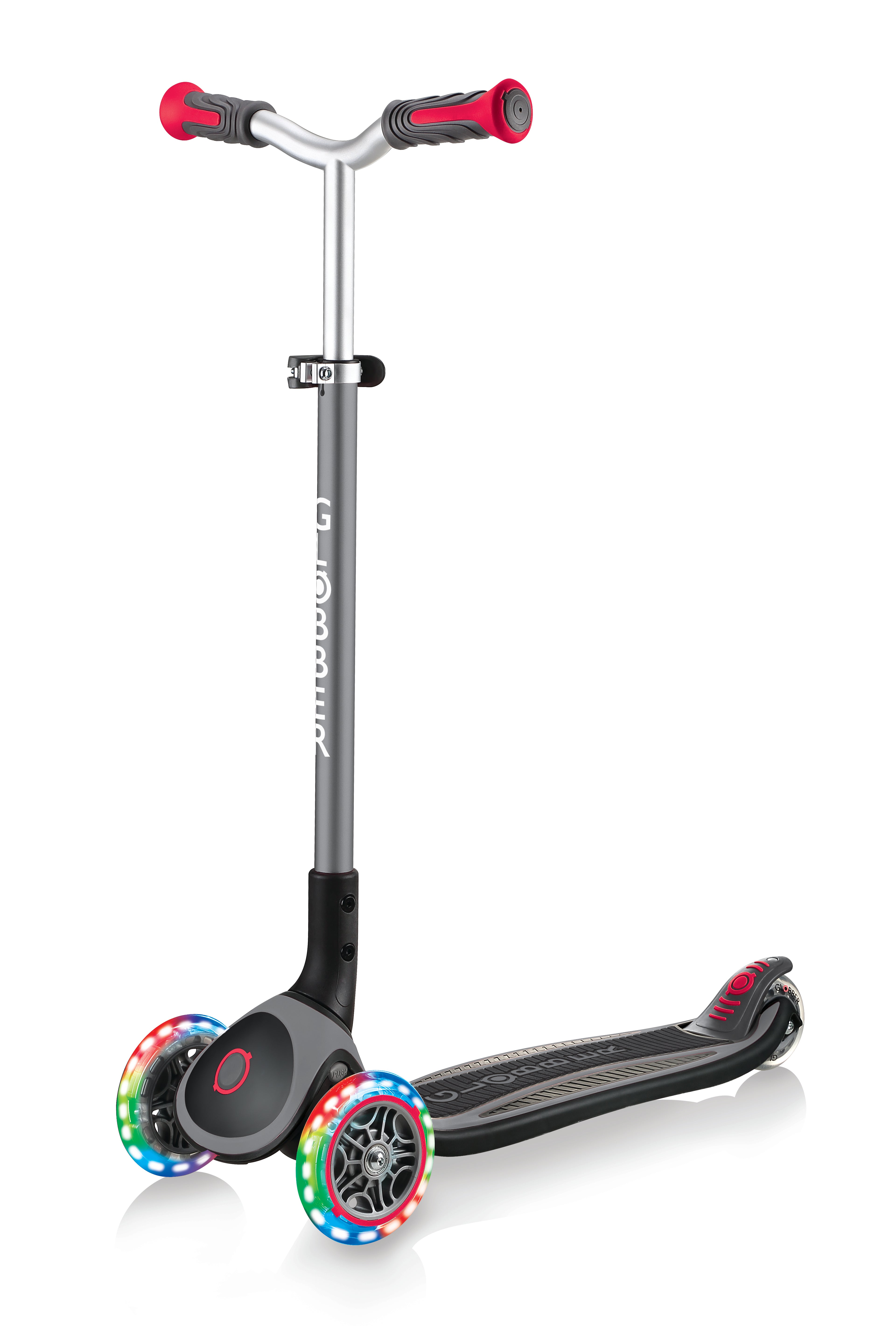Master LIGHTS kids scooter delivers more on everything you need. A big, super wide deck design, which comes with high-quality, soft EVA foam for added comfort; an extra adjustable scooter with a 5-height T-bar, for usage into your kid's teenage years; it comes with LED front wheels, which flash in red, green and blue and it's a foldable scooter with a safe patented folding system, for easy storage!