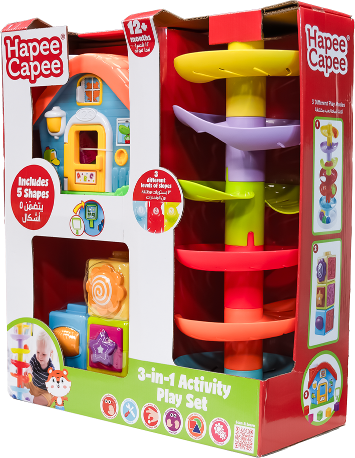 يحتوي طقم الألعاب التفاعلي 3 في 1 من هابي كابي على 3 مجموعات من الأنشطة التي يمكن للطفل الاستمتاع بها - بيت فرز الأشكال، وقطع بناء قابلة للتكديس، ولعبة الكرة ذات الارتفاع 47.5 سم. ستعمل الألوان الزاهية والنابضة بالحياة على تنشيط حواس طفلك بصريًا وتشجيع التنسيق بين اليد والعين ومهارات حل المشكلات.