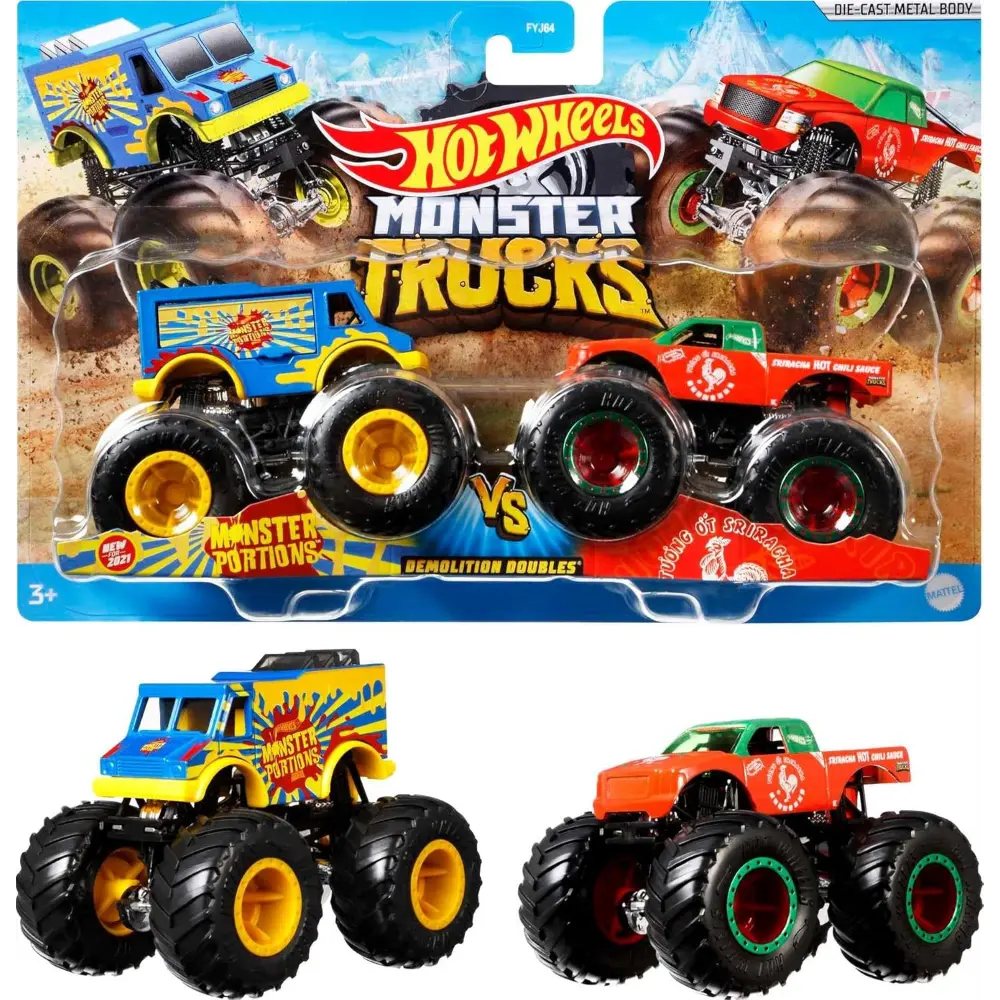 The Hot Wheels® Monster Trucks Demolition Doubles™ pack doubles the action with two Monster Trucks ready to square off in head-to-head battles! Each of the two die-cast vehicles is 1:64 scale and features the giant wheels and big personalities kids 3 years old and up love they'll want to collect them all. Each set sold separately, subject to availability. Colors and decorations may vary.