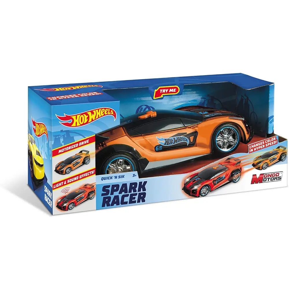 سيارة هوت ويلز سبارك ريسر مع أضواء وأصوات - سريعة وقوية. تتغير ألوانها من البرتقالي إلى الأحمر أثناء انطلاق السيارة! بضغطة زر، استمع إلى صوت المحرك وهو ينتقل إلى وضع التشغيل الفائق وشاهد جسم السيارة يتحول إلى لون جديد تمامًا. تحتوي السيارة على أضواء وأصوات وموسيقى! للأعمار 3 سنوات فما فوق. 3 بطاريات "AA" متضمنة.