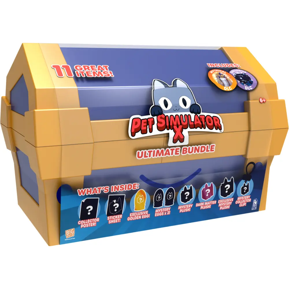 From the hit-game Pet Simulator X comes the Ultimate Bundle! This 12Inch treasure chest is a reusable container, that opens to reveal 11 incredible items inside! This instant collection includes: 3 Mystery Eggs (including 1 Exclusive Cyborg Dragon Golden Egg), 3 Plushies (including Exclusive Sapphire Phoenix 6Inch plush), a poster/collector sheet, an exclusive holographic dragon sticker, 1 mystery collector clip, and TWO DLC code coins (mythical + bonus exclusive pet) for use in-game!