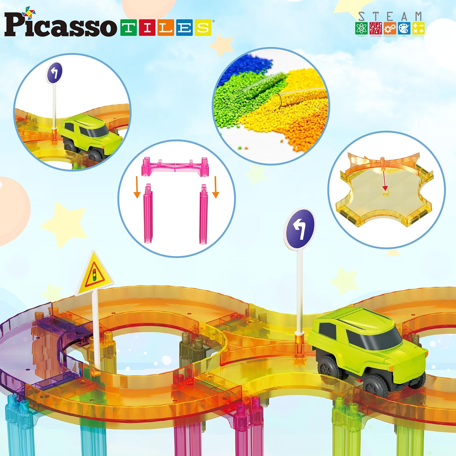 Part of the Mini Diamond Collection, the PicassoTiles 40-Piece On-the-Go Race Track set combines STEM learning with travel-friendly fun. Compact and portable, this magnetic tile race track allows children to build, race, and explore anywhere. Quick-connect tiles make assembly effortless, encouraging hands-on play and imaginative adventures on the move. (Vehicle requires 1xAA battery, not included.)
