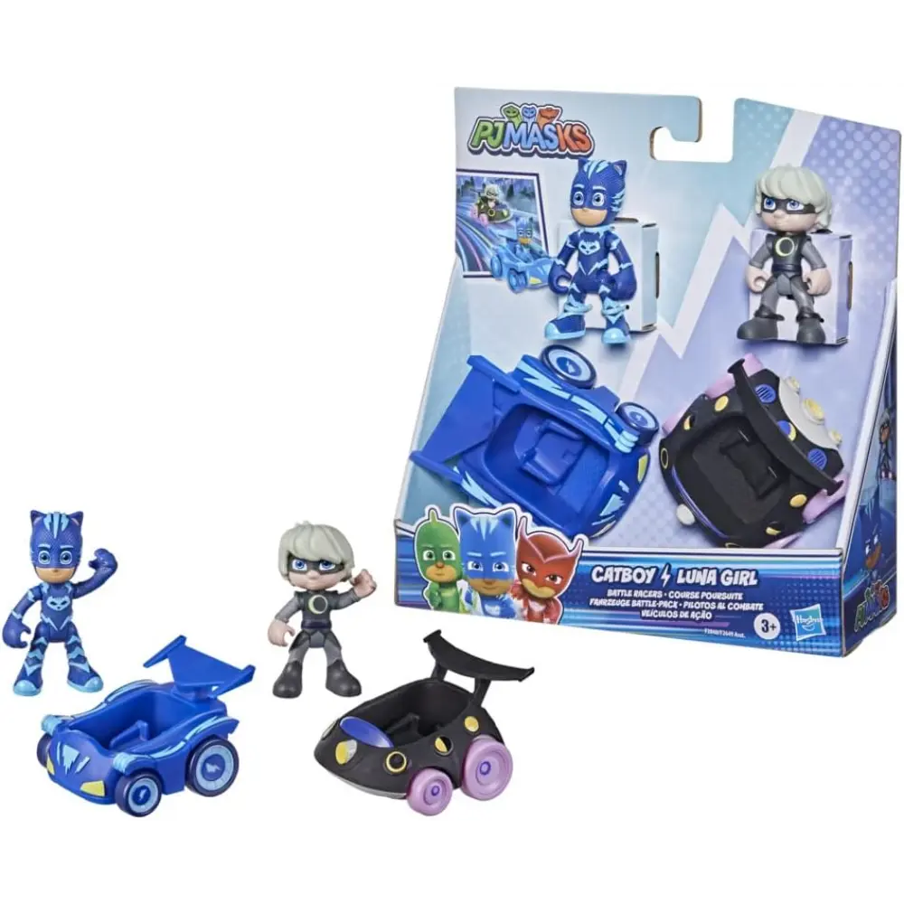 سيارات السباق كاتبو من بي جي ماكس ضد لونا جيرل جاهزة للانطلاق! تأتي هذه المجموعة الرائعة من المركبات والأشكال مع سيارتين صغيرتين من بي جي ماكس و شخصيتين متحركتين من بي جي ماكس، حتى يتمكن الأطفال من مواجهة شخصية كاتبو وسيارة كات-كار الخاصة به، وشخصية لونا جيرل ومركبتها في سباقات ملحمية. يمكن للشخصيات الجلوس في المركبات، مما يسمح لأطفال ما قبل المدرسة بإعادة تمثيل مشاهدهم المفضلة من البرامج الترفيهية أو تخيل مغامرات جديدة خاصة بهم! الشخصيات متوافقة مع Hasbro Hero ID-equipped
