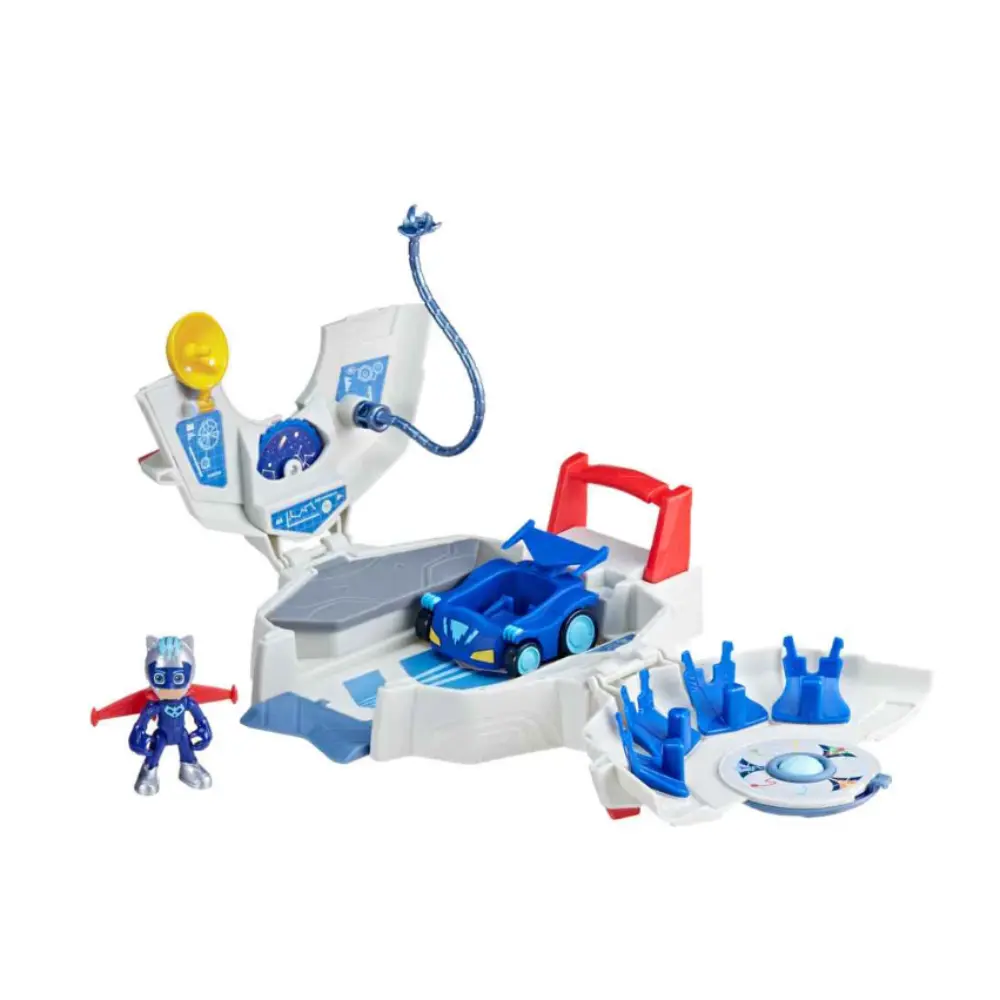 يُفتح هذا المُلعب الخاص بـ PJ Masks ليُظهر مركز عمليات Power Heroes (مُكمّل بأربعة فتحات تُحفظ فيها شخصيات PJ Masks المصغّرة)، وعجلة مسح سماوية، ورافعة سيارات! يمكن للأطفال إطلاق سيارة PJ Masks المرفقة بالضغط على المقبض. يمكن لشخصية Catboy الجلوس في السيارة لخوض مغامرات مليئة بالإثارة! يتضمن هذا المُلعب للأطفال إكسسوارين ذوي طابع فضائي لمزيد من القوة في سرد القصص: حقيبة ظهر نفاثة يمكن للشخصية ارتداؤها فعليًا، ورباط فضائي قابل للتركيب.