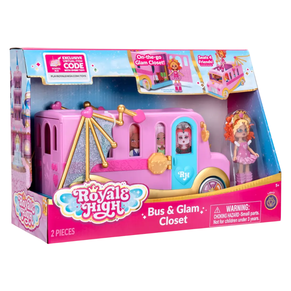 ادخلي عالم Royale High الافتراضي واكتشفي مجموعة الألعاب "الحافلة وخزانة الملابس الأنيقة"! هذه المجموعة الرائعة مثالية لاحتياجات أزيائكِ لدمياتكِ. تتسع لما يصل إلى أربع صديقات (تُباع كل دمية على حدة) وتفتح لتكشف عن خزانة ملابس رائعة! قومي برحلة أنيقة في المدينة مع دميتكِ الحصرية بطول 3 بوصات، واستردي رمز اللعبة لتلقي حافلة مدرسية في عالم Royale High الافتراضي. هذه المجموعة مناسبة للأعمار من 5 سنوات فما فوق.