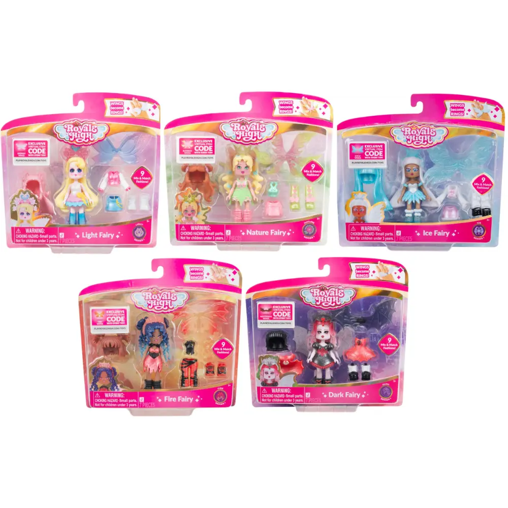 أهلاً بكم في عالم رويال هاي الساحر! رويال هاي، أكبر لعبة قائمة على الموضة في عالم الألعاب، تدعوكم لاستكشاف عالم افتراضي يفيض بالموضة والأناقة. تأتي الدمى المستوحاة من اللعبة، بطول 3 بوصات، مع تسع قطع ملابس قابلة للمزج والمطابقة، وأجنحة الجنيات تصبح خاتمًا قابلًا للارتداء! تمثل كل من الجنيات الخمس في المجموعة الأولى عنصراً، بما في ذلك الظلام، والثلج، والنار، والنور، والطبيعة. تحتوي كل دمية على رمز لعبة UGC قابل للاسترداد لتزيين جنيتك في جميع التجارب. مرخصة رسميًا.