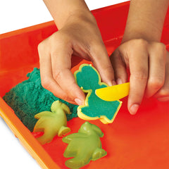 • يتضمن 600 جرام من الرمل القابل للتشكيل، و13 قالبًا على شكل ديناصورات، وصينية لعب.