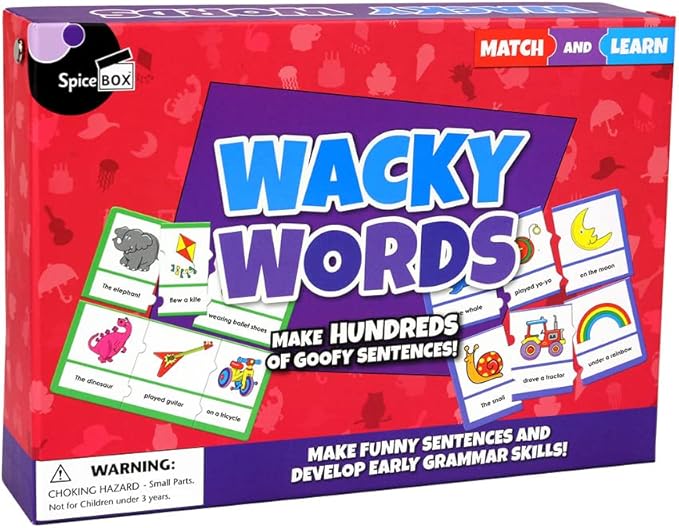 SpiceBox Match & Learn Wacky Words is a fun word-building game for kids. Mix and match cards to create silly sentences and learn new words. Great for early reading skills and family playtime.