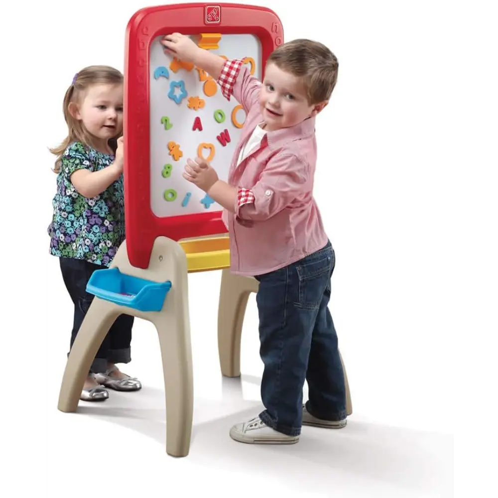 يُغطي لوح الرسم متعدد الاستخدامات من ستيب2 All Around Easel for Two كل من اللعب الإبداعي الفردي وأوقات اللعب مع الأصدقاء. يتميز هذا اللوح ذو الوجهين بخاصية الكتابة عليه بالمسح الجاف المعدني من جانب، ولوح أسود من الجانب الآخر. يحتوي على صندوقي تخزين قابلين للإزالة وحامل كبير لإبقاء لوازم الفن في متناول اليد، مثل مجموعة المغناطيسات الإسفنجية المكونة من 94 قطعة المرفقة مع اللوح! يمكن للفنانين الصغار التعبير عن إبداعاتهم مع تعزيز مهاراتهم الحركية الدقيقة أثناء الكتابة والرسم ووضع المغناطيسات. يُعدّ اللوح سهل التركيب، ولا يتطلب سوى الحد الأدنى من التجميع من قبل الكبار.