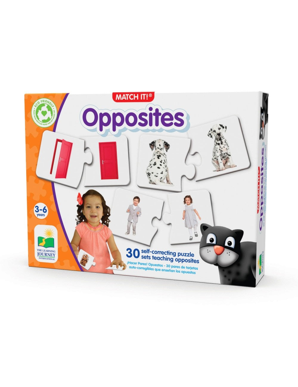 تُقدم لعبة "طابقها! الأضداد" مجموعة ملونة من 30 بطاقة أحجية تُشكل تحديًا للأطفال لتحديد الأضداد. تُصوَّر الألغاز برسوم حيوية توضح سيناريوهات متضادة. كما أن البطاقات ذات تصحيح ذاتي، ولن تتناسب إلا مع زوجها المطابق، وهي طريقة ممتعة لتعلم الأضداد. موصى بها للأعمار 3 سنوات فما فوق.