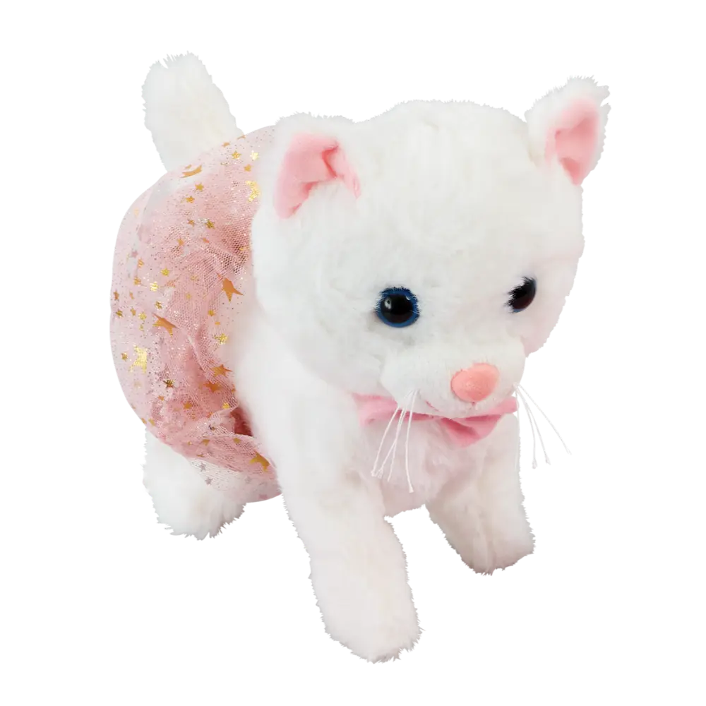 Get ready for hours of pampering and playful fun with the Happy Pets Walk Along Cat Deluxe! This interactive pet cat features soft white fur, tail-shaking action, and adorable meow sounds activated by the attached lead’s button. Kids can take their cuddly kitty for a walk around the house or outside to show off their new furry friend. The set includes a grooming brush for brushing its soft fur, a sparkly tutu, and a stylish neckerchief to dress up the cat in style. Pretend feeding is made fun with a pink bowl and treat box, adding to the realistic pet care experience. Perfect for children aged 3 and above, this motorized cat brings joy and imaginative play to every day.