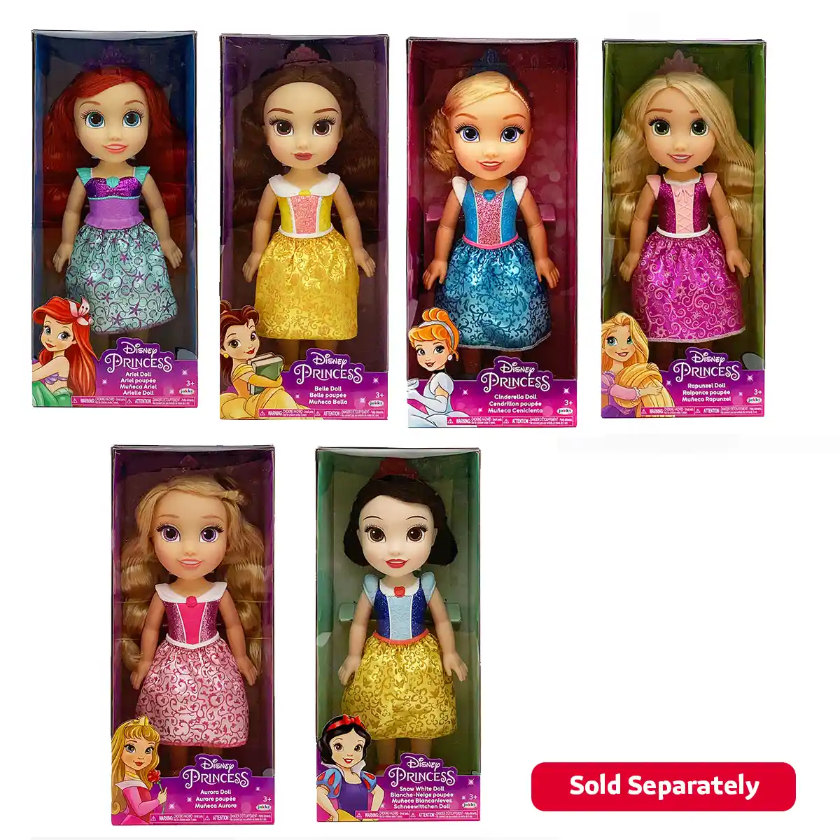 Your little princess can recreate his or her favorite scenes from the hit Disney film or create new stories with the doll. Each come with their signature dress (molded bodice), tiara and shoes. Collect all Disney Princess characters: Ariel, Belle, Cinderella, Rapunzel, Aurora, and Snow White (each doll sold separately).