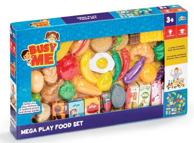 Your cupboards will never be empty with the Busy Me Mega Play Food Set.Get ready for cooking and baking play. Encourage imaginative role-playing fun with this food set. This awesome pack comes with over 40 pieces of toy food, including favourites such as chocolate, fruit, cereal, chips, and more. You can make anything with this variety of ingredients!Enjoy a pretend picnic outside, prepare a fancy dinner party, or just snack in your playhouse. The options are endless!