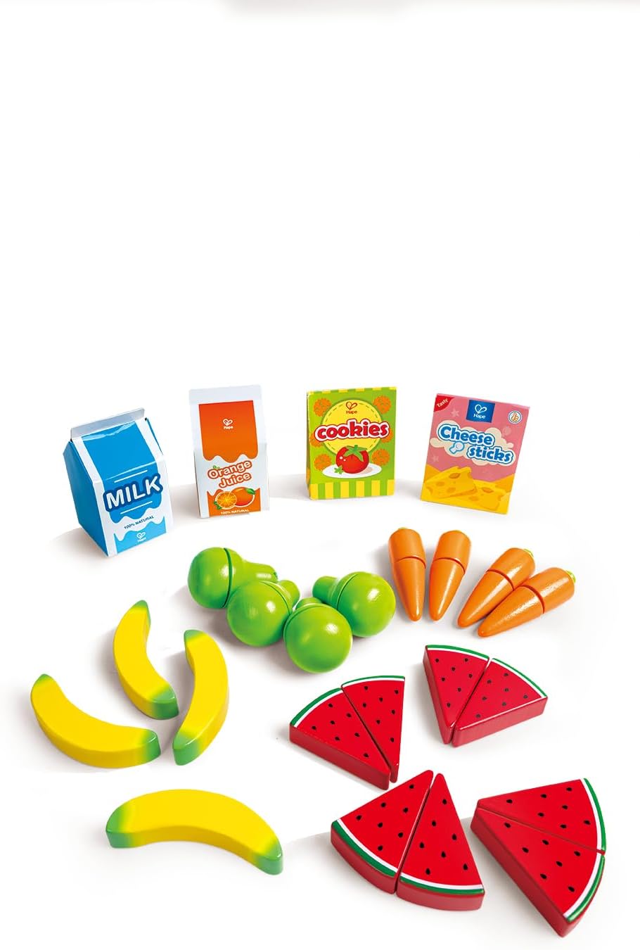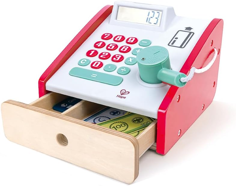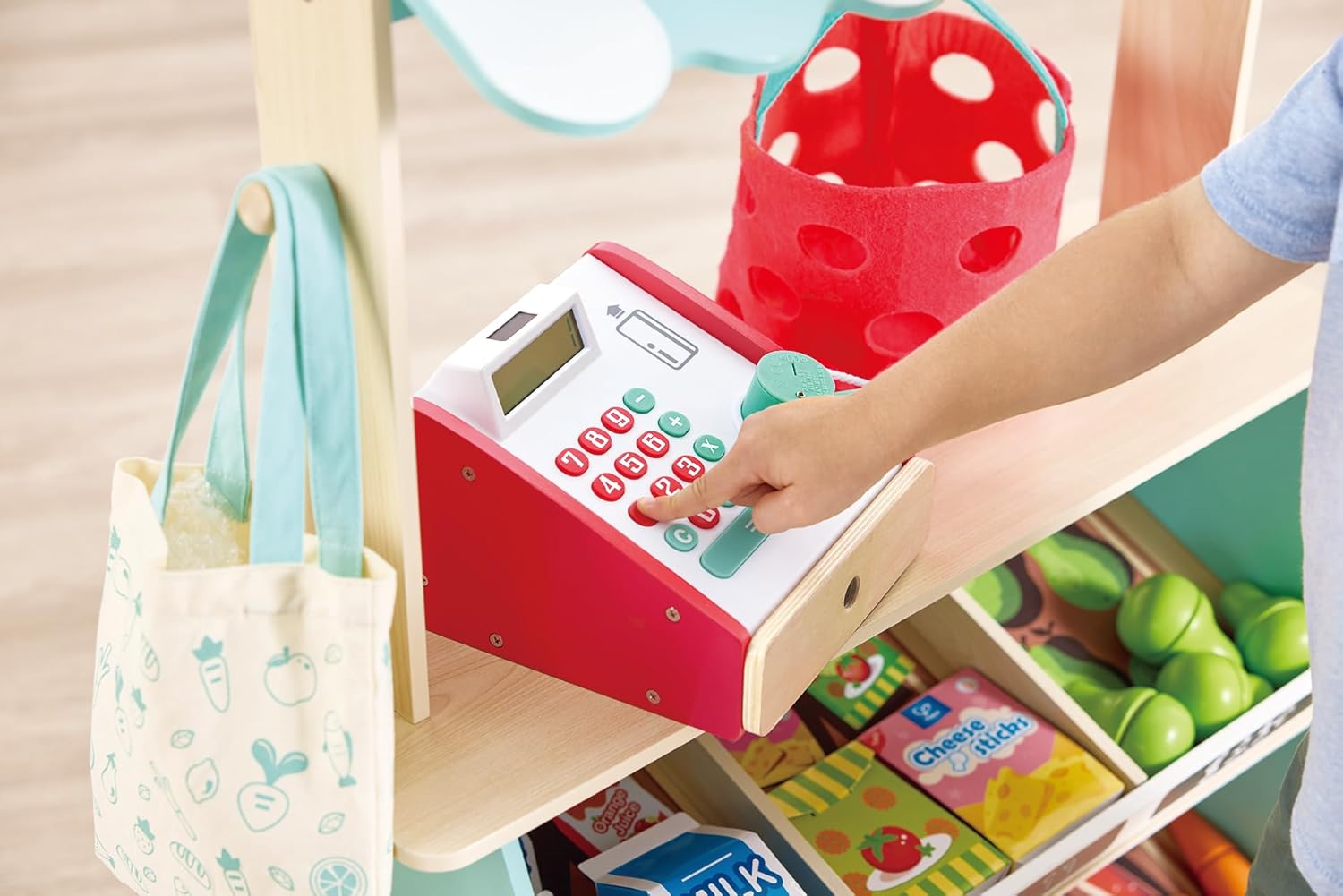 The set features a cash register with a scanner that lights up and beeps, helping children develop basic calculation and numerical skills. Two display shelves provide extra space for produce, encouraging organization and imaginative play.