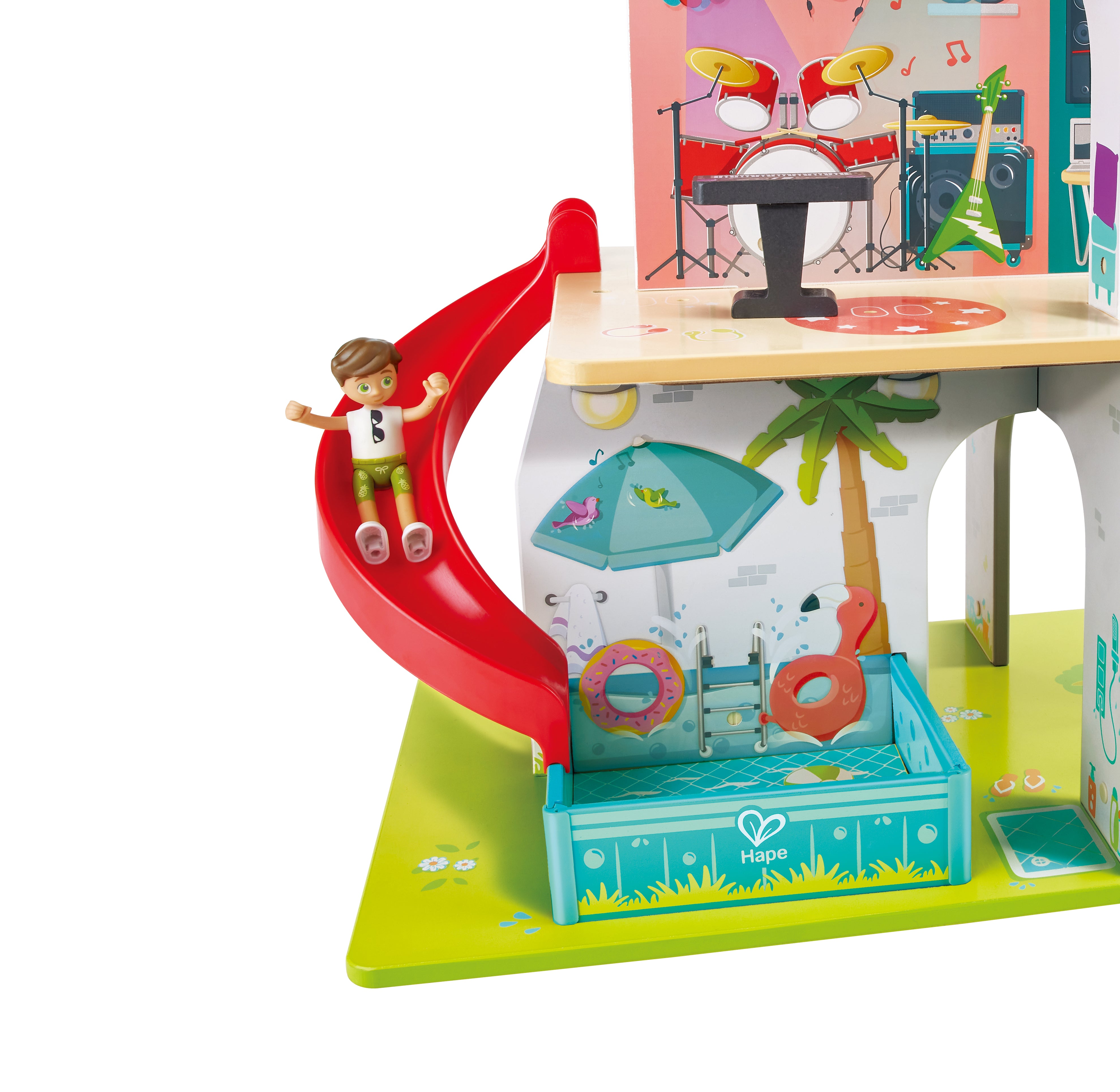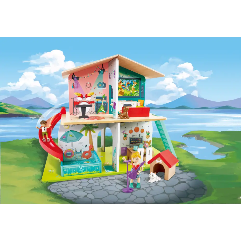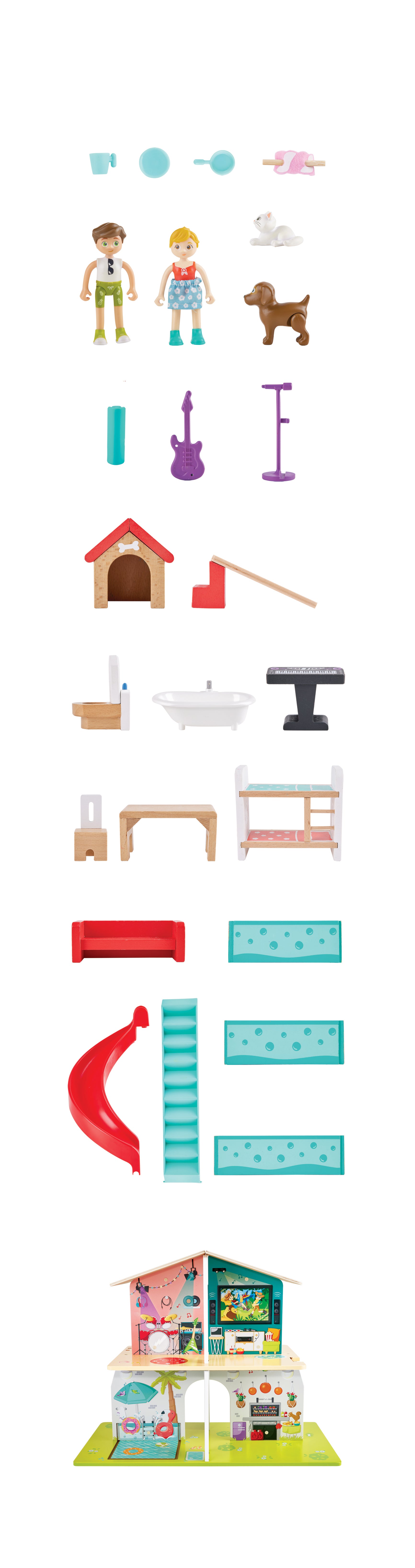 The playhouse comes fully equipped with real-life furniture and accessories, including a piano, guitar, microphone, sofa, table and chairs, dishes and cups, fish skewers, a toilet, bunk bed, slide, swing, a dog and cat, plus posable girl and boy figures.
