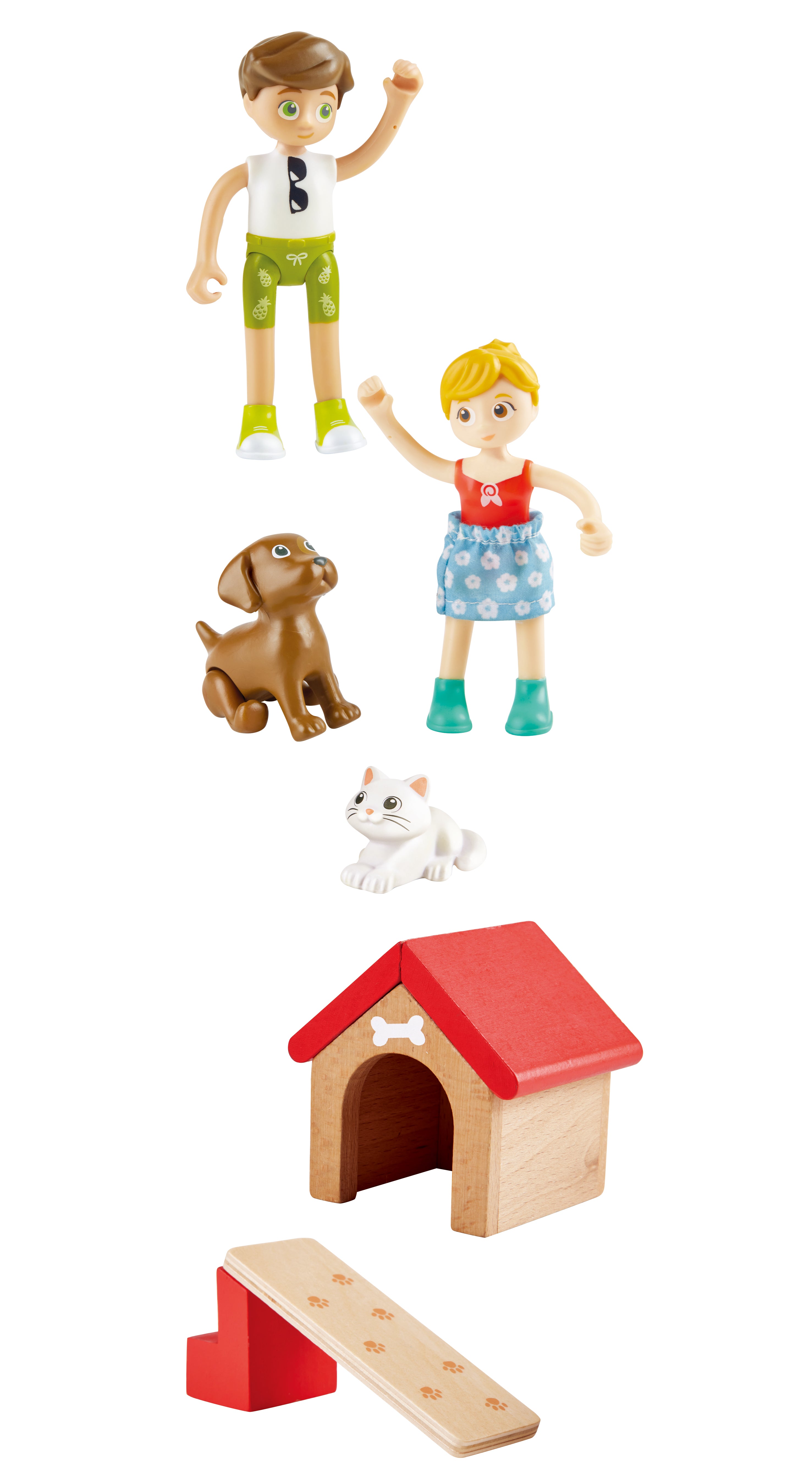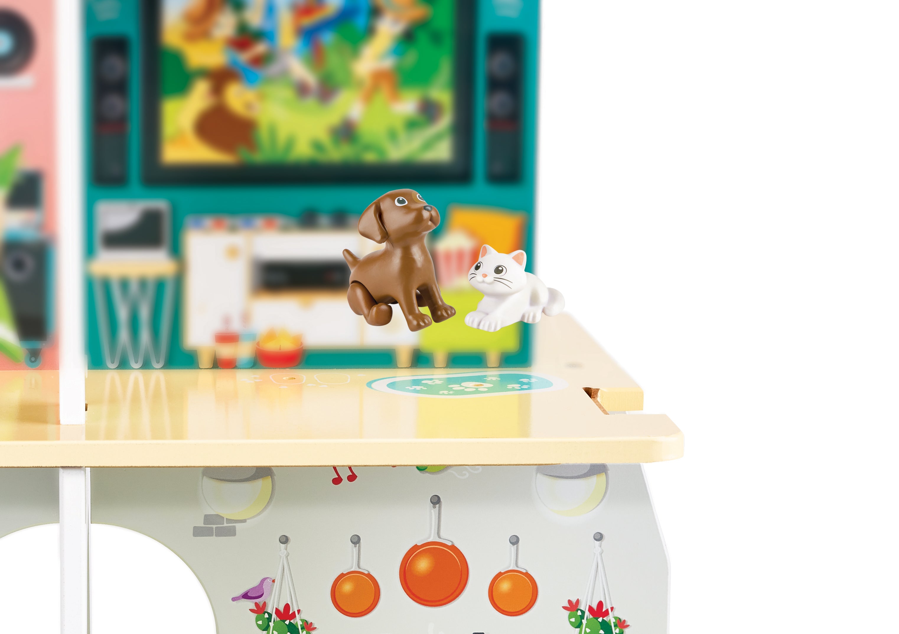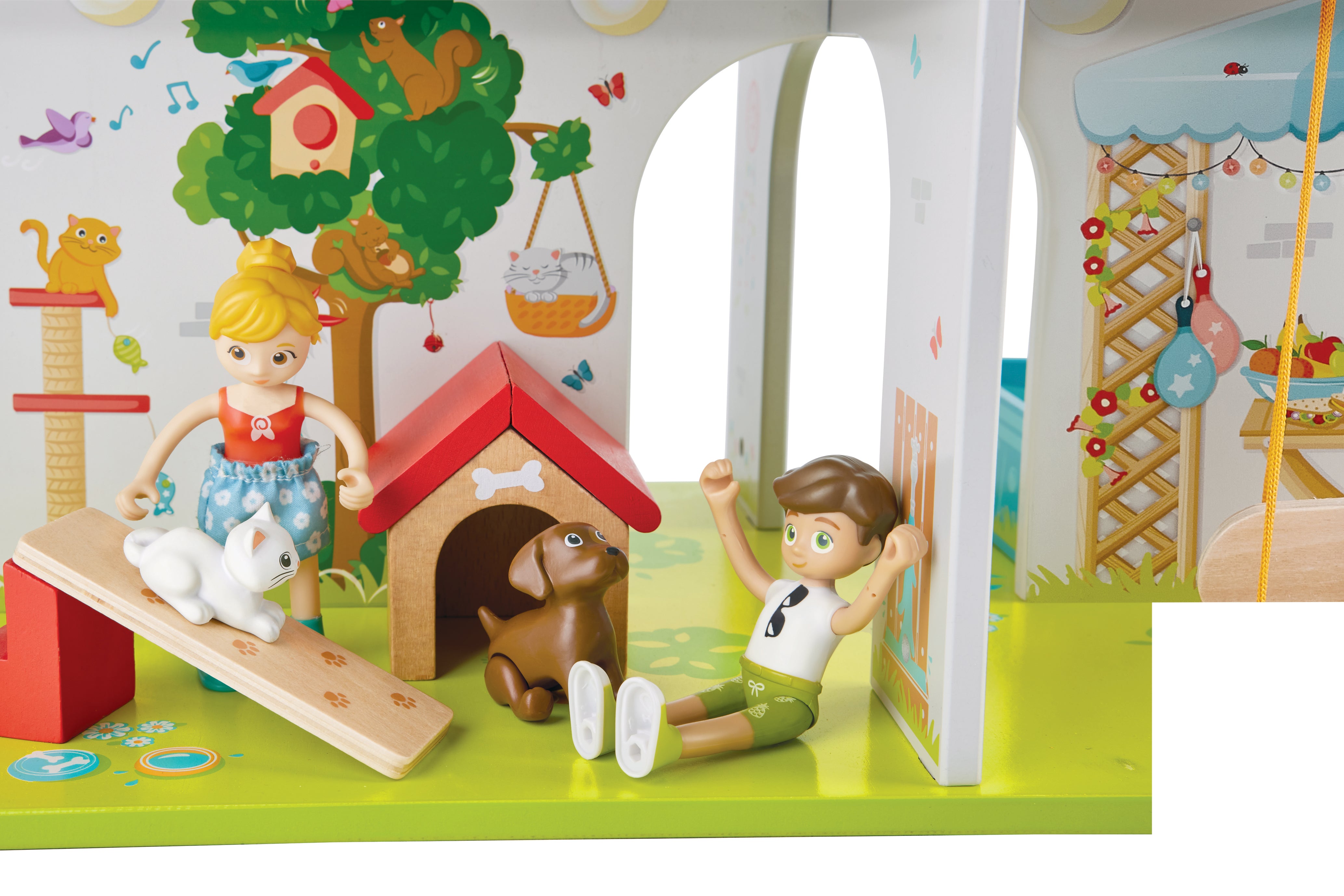 The playhouse comes fully equipped with real-life furniture and accessories, including a piano, guitar, microphone, sofa, table and chairs, dishes and cups, fish skewers, a toilet, bunk bed, slide, swing, a dog and cat, plus posable girl and boy figures.