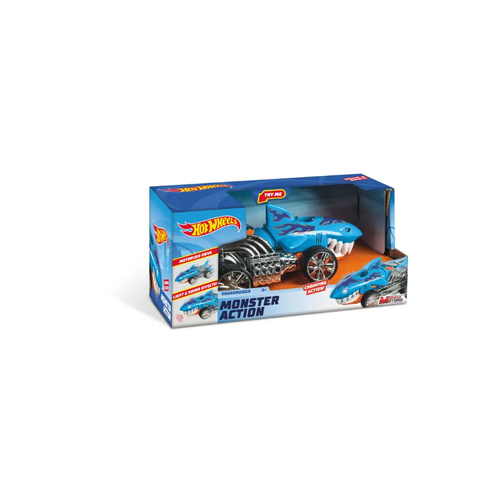 Sharkruiser glides onto the scene chomping and rocking to the music! Hot Wheels Extreme Action Sharkruiser will take a serious bite out of the competition while revving up and screeching across the finish line. Forward/backward rocking motion accompanies energetic lights and music. A monstrous growl indicates that Sharkruiser is about to rev up and peel out while you also have the option of sending him speeding off before screeching to a halt; 3 different buttons for 3 different light, sound, and driving options.