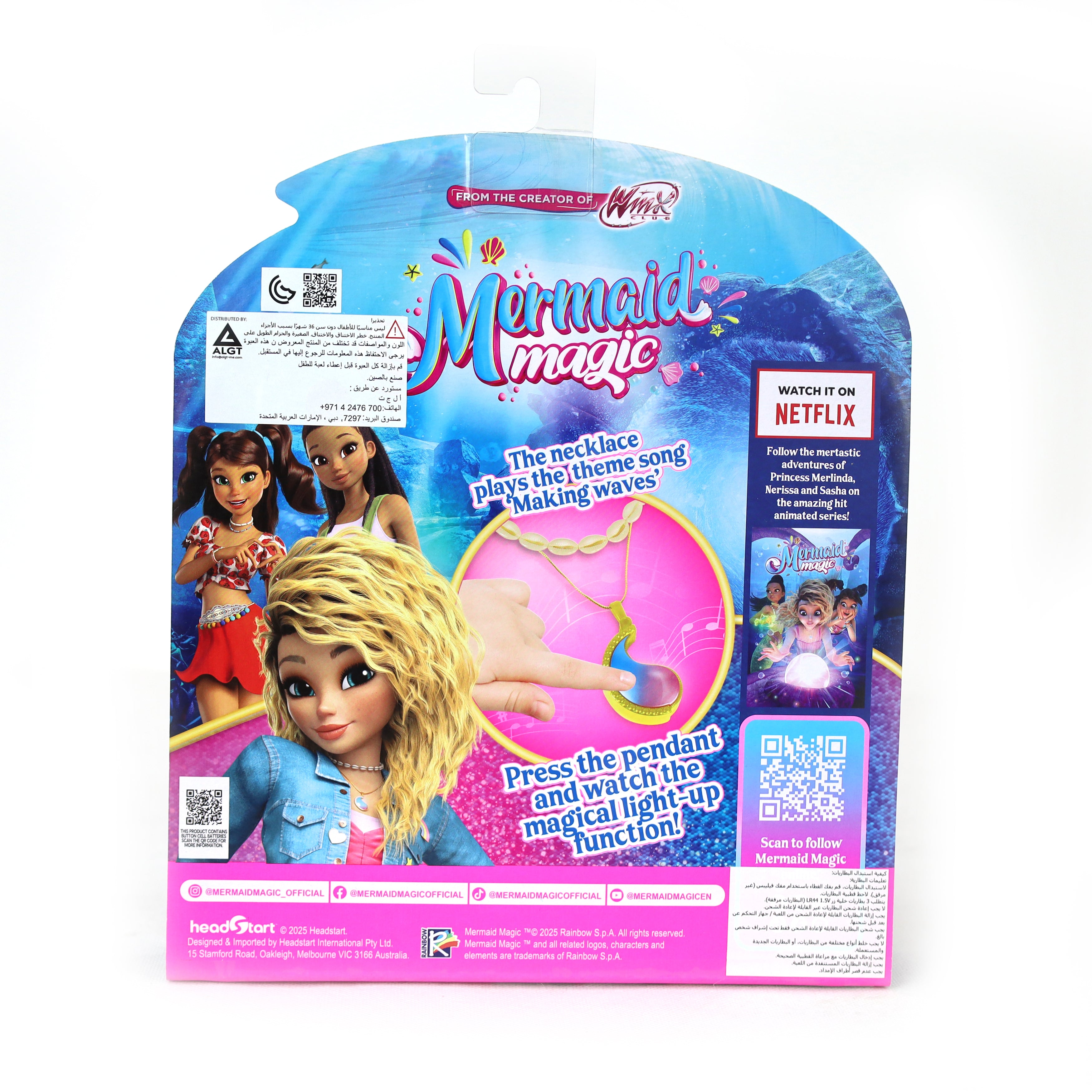 Discover the magic of the sea with the Mermaid Magic Necklace Merlinda! This enchanting battery-operated necklace features a metallic finish and a sparkling pendant that lights up at the touch of a button. When activated, it illuminates and plays the captivating theme song “Making Waves”, creating a magical experience for every wearer. Elegant and fun, the necklace is perfect for playtime or special occasions, and the easy on/off switch lets children enjoy the glow and music whenever they like.