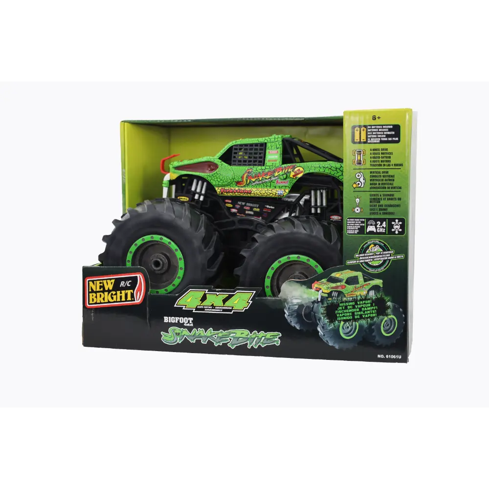 New Bright 1:10 Scale 44 RC Snake Bite Lights Sounds Monster Truck is a detailed design of the newest member of Team Bigfoot! The intimidating Snakebite takes 2021 to next level with new details and features, including its amazing Vertical Strike Mode (Stand Up Drive). 15 inches in length, this large RC is clad with a cracked paint anamorphic body, authentic decals, fangs and tongue.