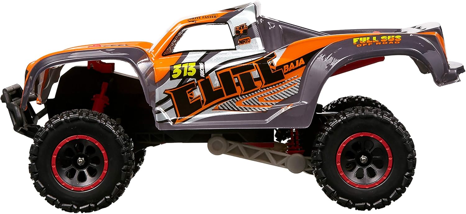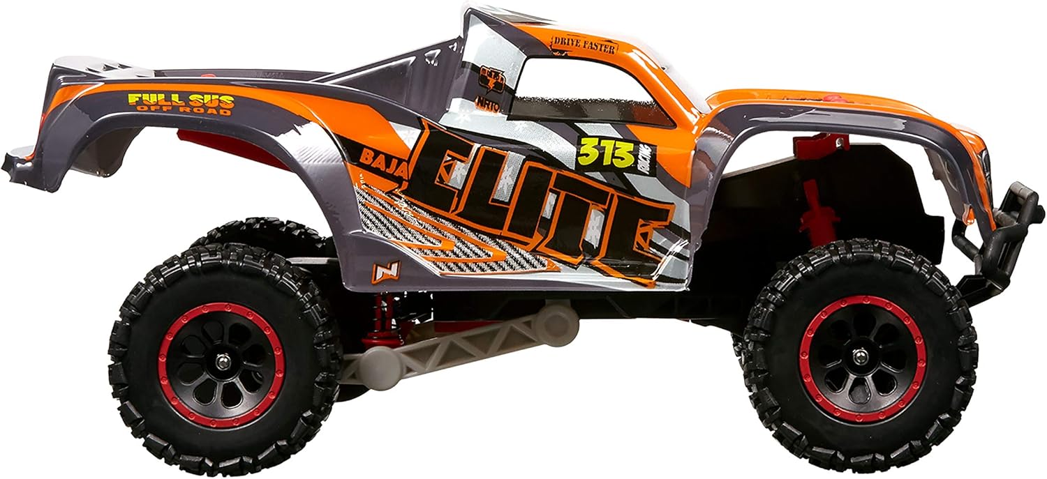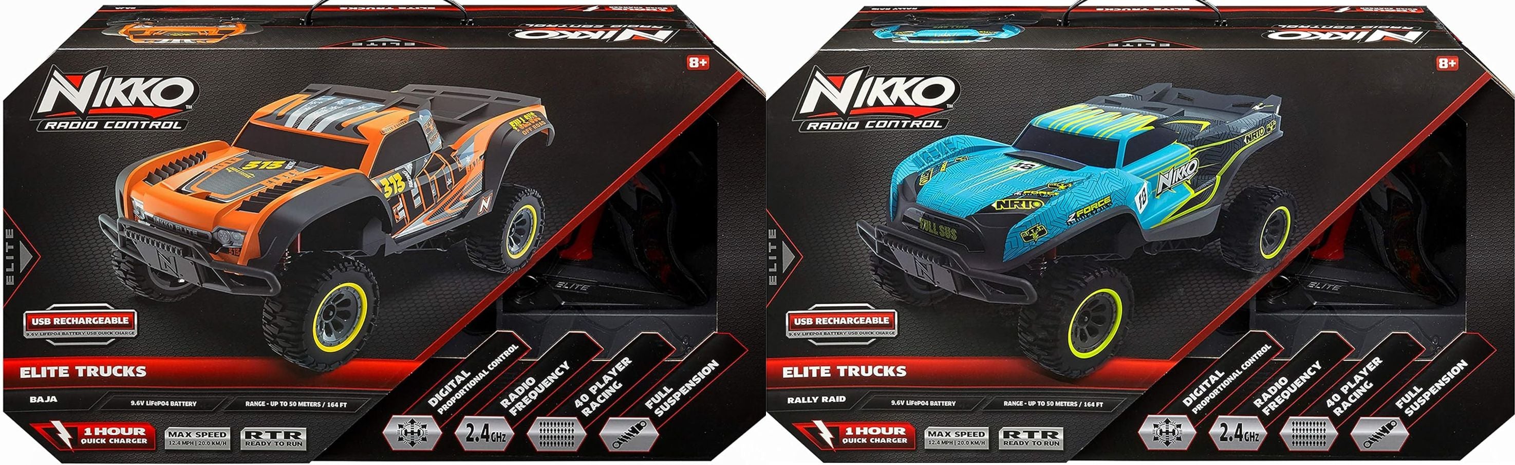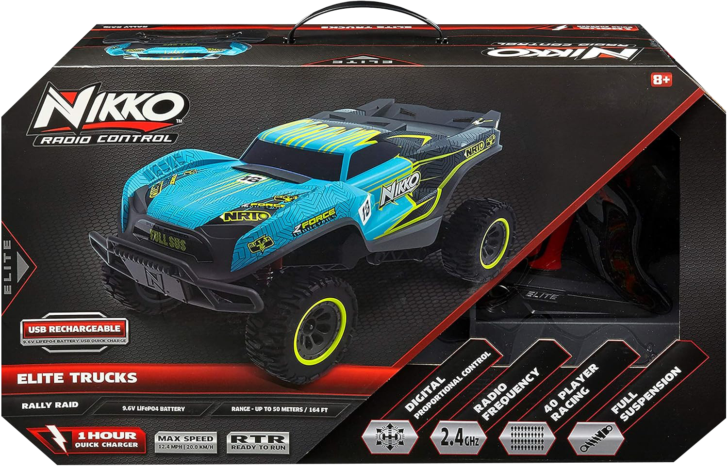 Experience top-tier off-road racing with the NIKKO Elite Trucks remote-controlled car. Built for speed and durability, this 4WD RC vehicle reaches thrilling speeds of up to 20 km/h, powered by a 9.6V Li-ion battery with USB quick charger. Its ultra-strong, lightweight vacuum-formed body houses a fully independent sprung chassis, metal steering rods, and a rear differential for superior control on diverse indoor and outdoor surfaces. The easy-to-use 2.4 GHz Nikko remote offers reliable connection up to 50 meters, allowing up to 40 racers to compete simultaneously without interference. Ready to race right out of the box with included batteries, this RC car delivers endless driving excitement for kids and enthusiasts alike.