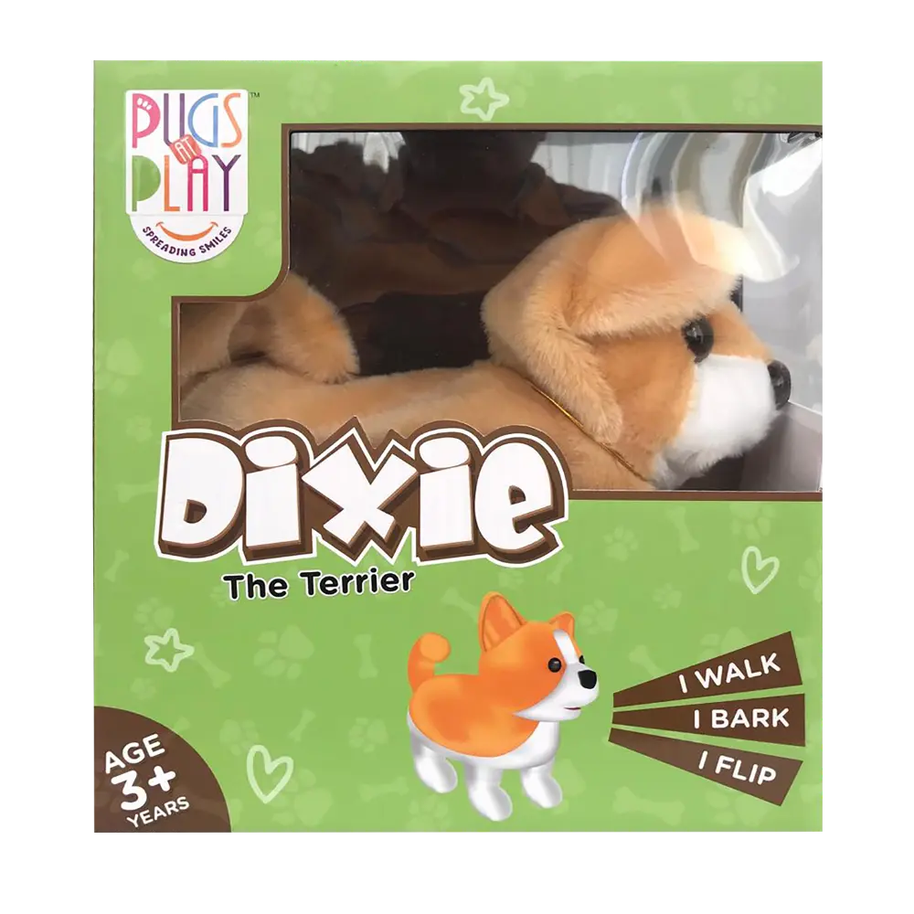 Dixie Flipping Dog - Jumping, Walking and Barking Dog. Soft toy, fantastic puppy which is battery operated than can do back flip jumping dog.