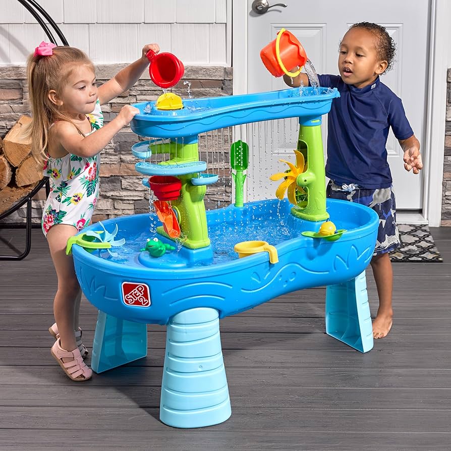 Turn your backyard into a mini water park with the Double Showers Splash Water Table™! Perfect for toddlers, this two-tier table combines fun rainfall showers with cause-and-effect learning. Pour water into the top waterfall tray to make it rain, activating a large spinner on one side and a teeter-totter on the other. The 360-degree design encourages kids to explore, share accessories, and practice fine and gross motor skills while discovering how water flows. Made in the USA with US and imported parts, it’s built for hours of splish-splash fun!