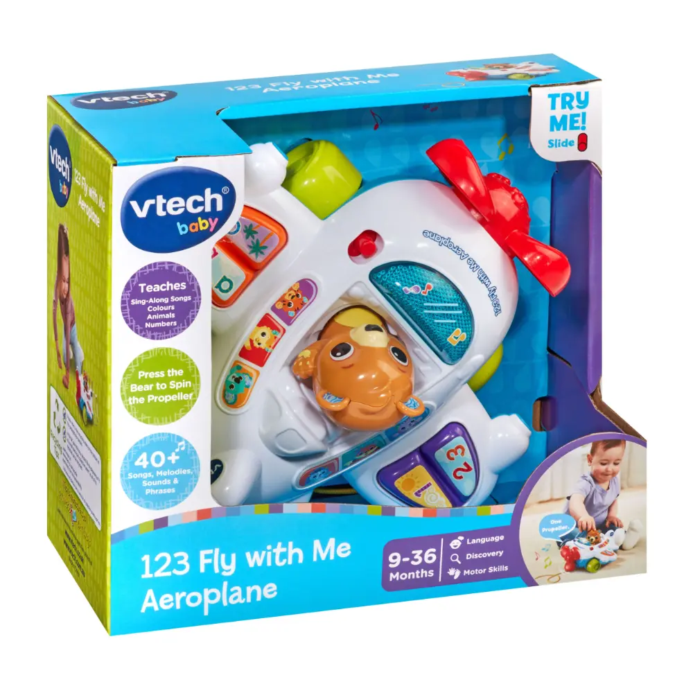 Take off on fun-filled adventures with Captain Bear and his interactive aeroplane! Kids will love zooming Captain Bear along, pressing his head to hear playful responses and watching the propeller spin. The light-up button on the front plays sing-along songs, while buttons on the wings teach early numbers and letter sounds. Pull or push Captain Bear to activate motion sensor sound effects that keep the fun going. With 3 sing-along songs and 10 melodies, this toy encourages active play, early learning, and musical enjoyment for little explorers.